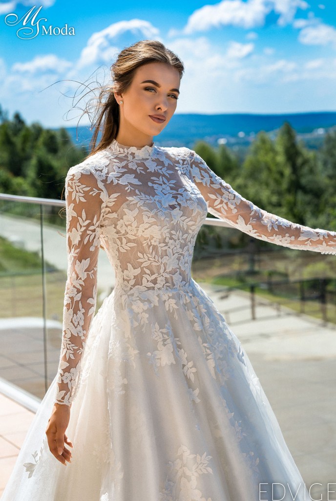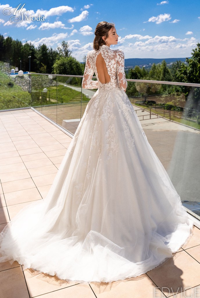 Emil: « Robe trapèze romantique à fines bretelles. Le haut est orné de dentelle mate contrastante à motif floral et d’empiècements en résille translucide. Le décolleté plongeant spectaculaire et le dos nu confèrent à la mariée une allure séduisante et féminine, tandis que la jupe à plusieurs épaisseurs, généreusement ornée de dentelle, apporte tendresse et romantisme. »
