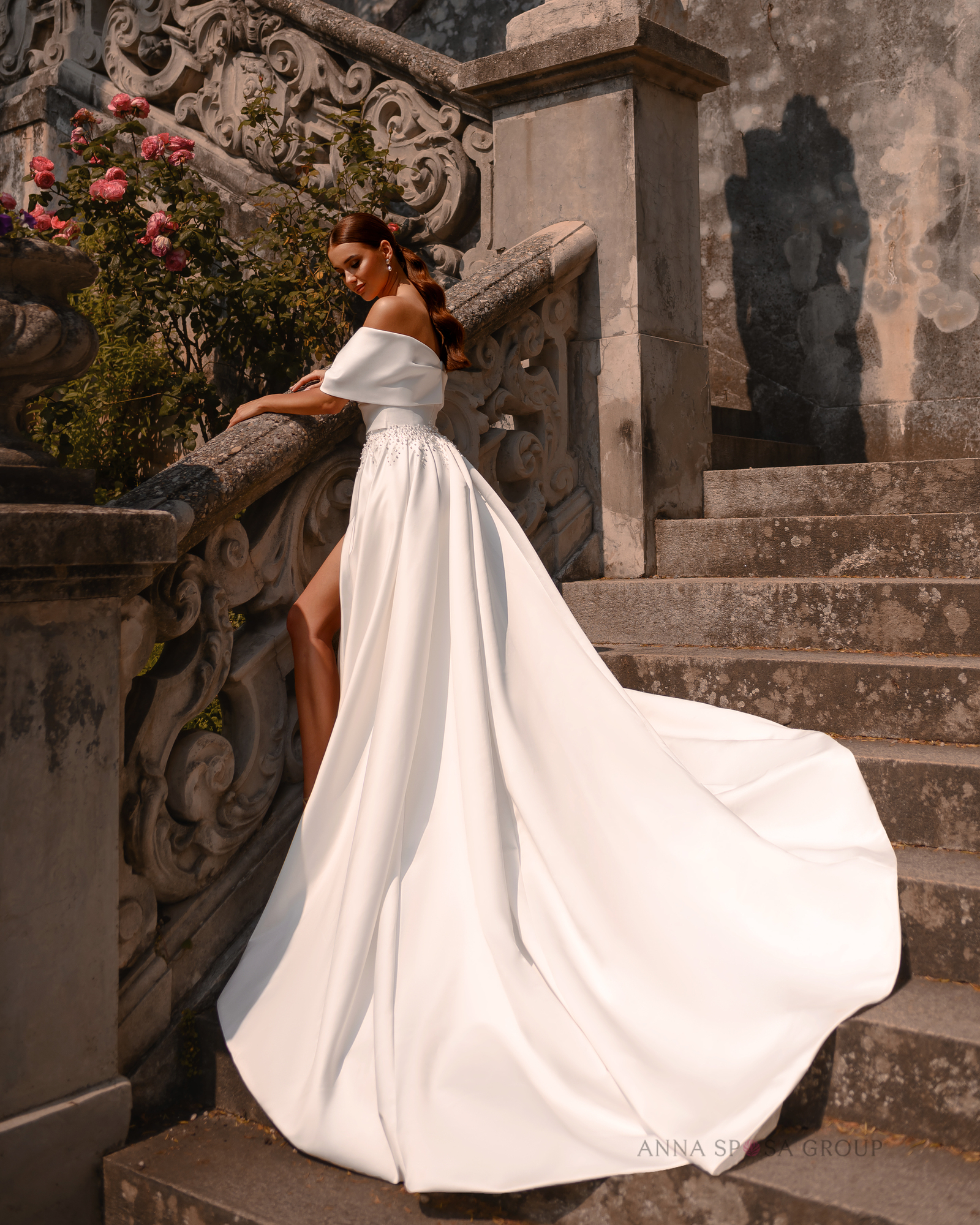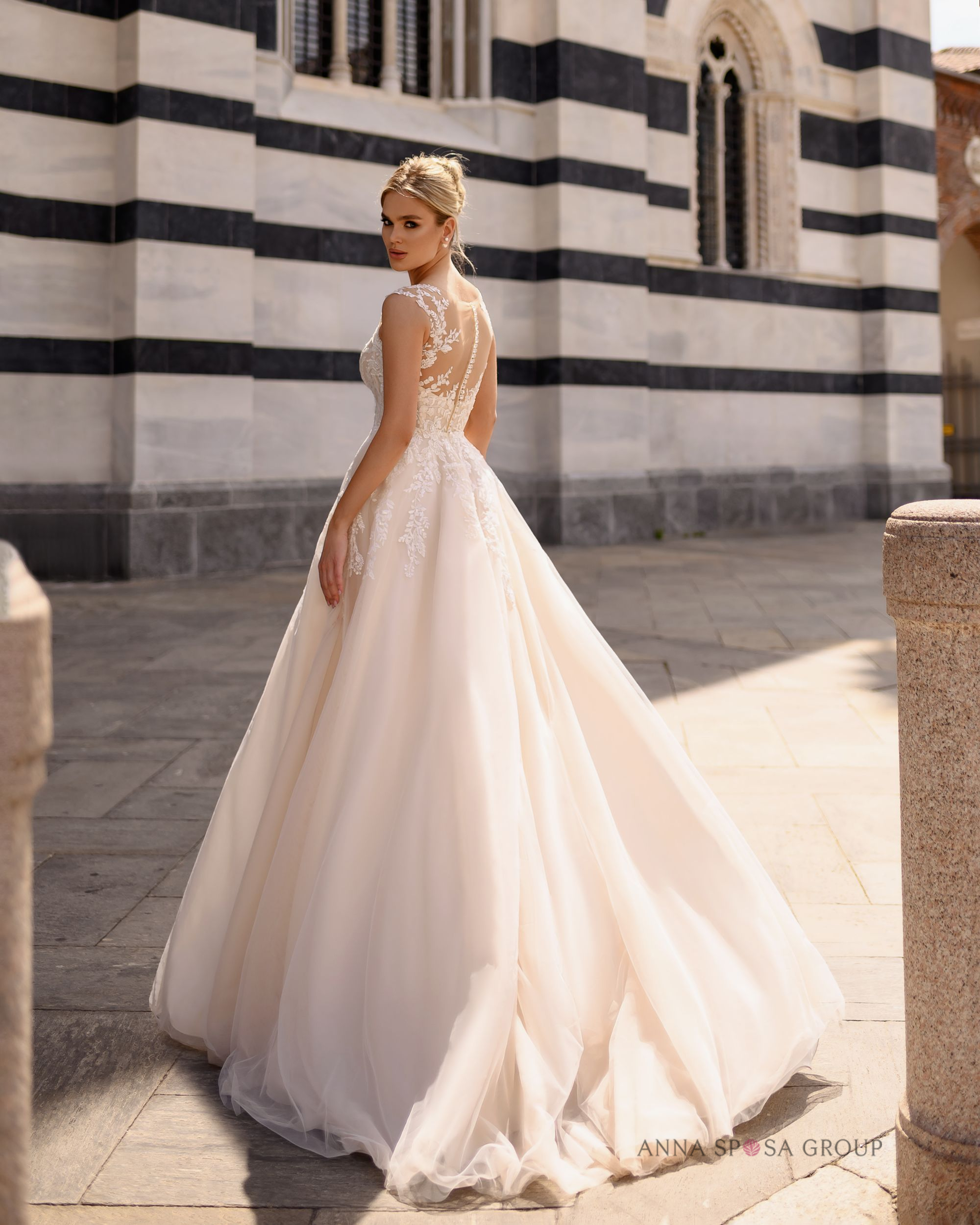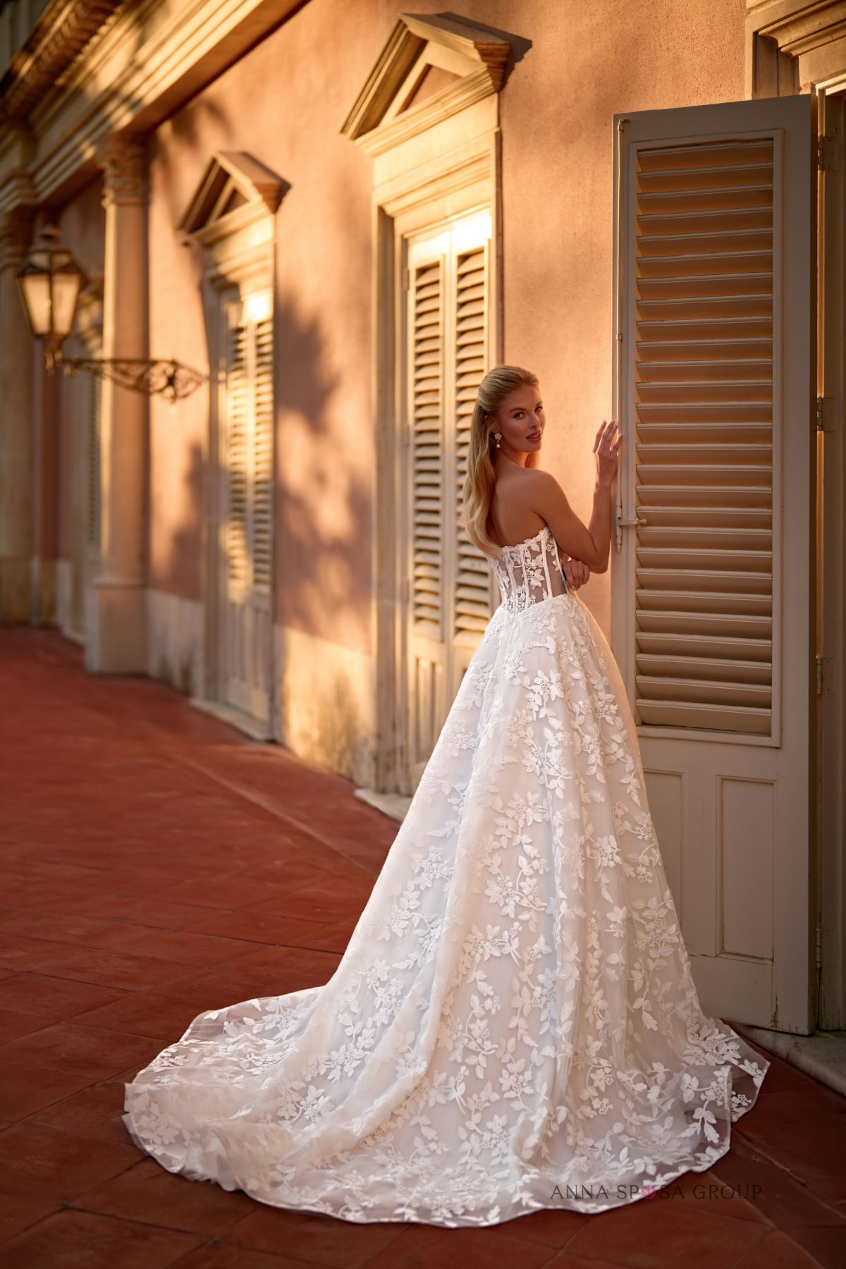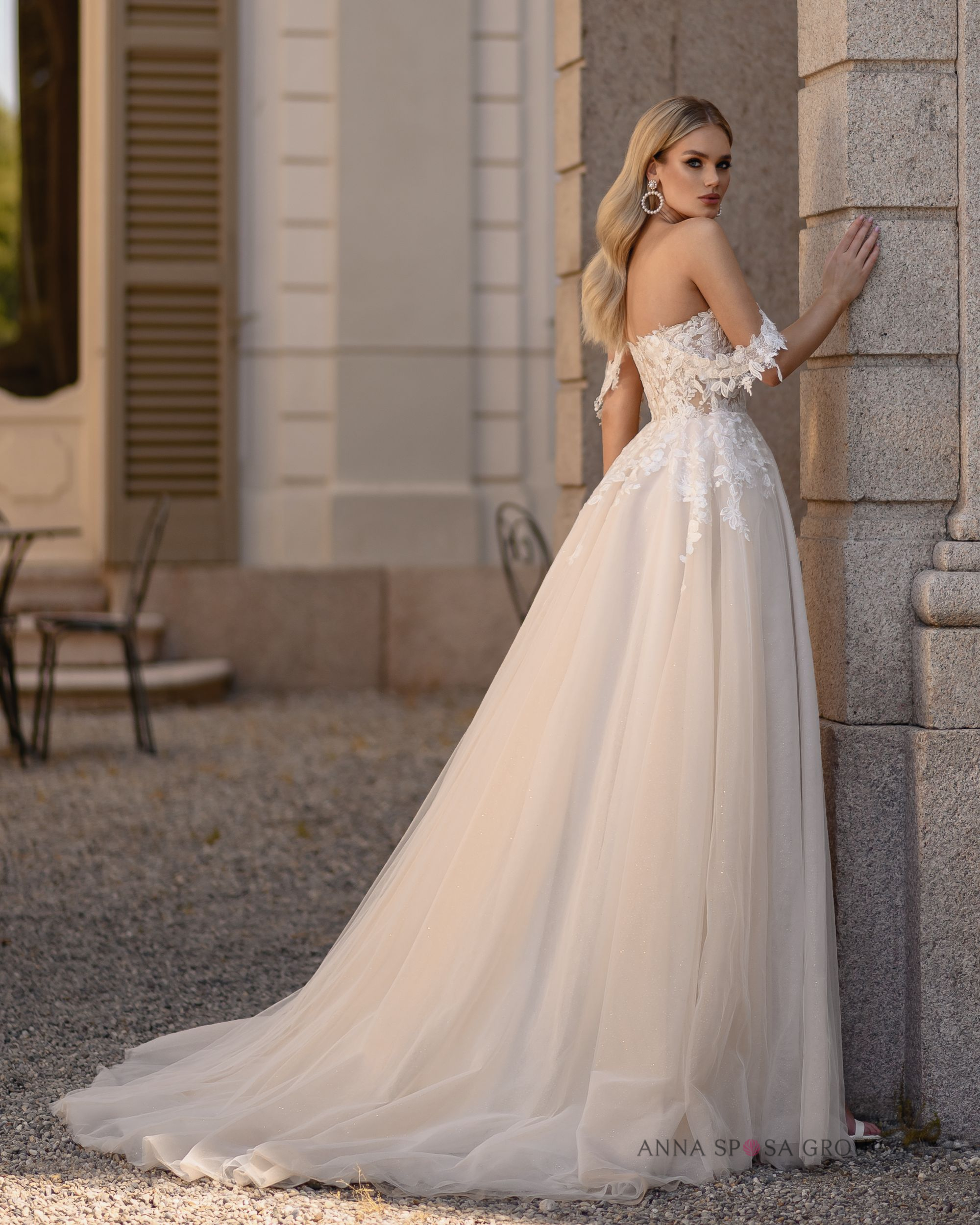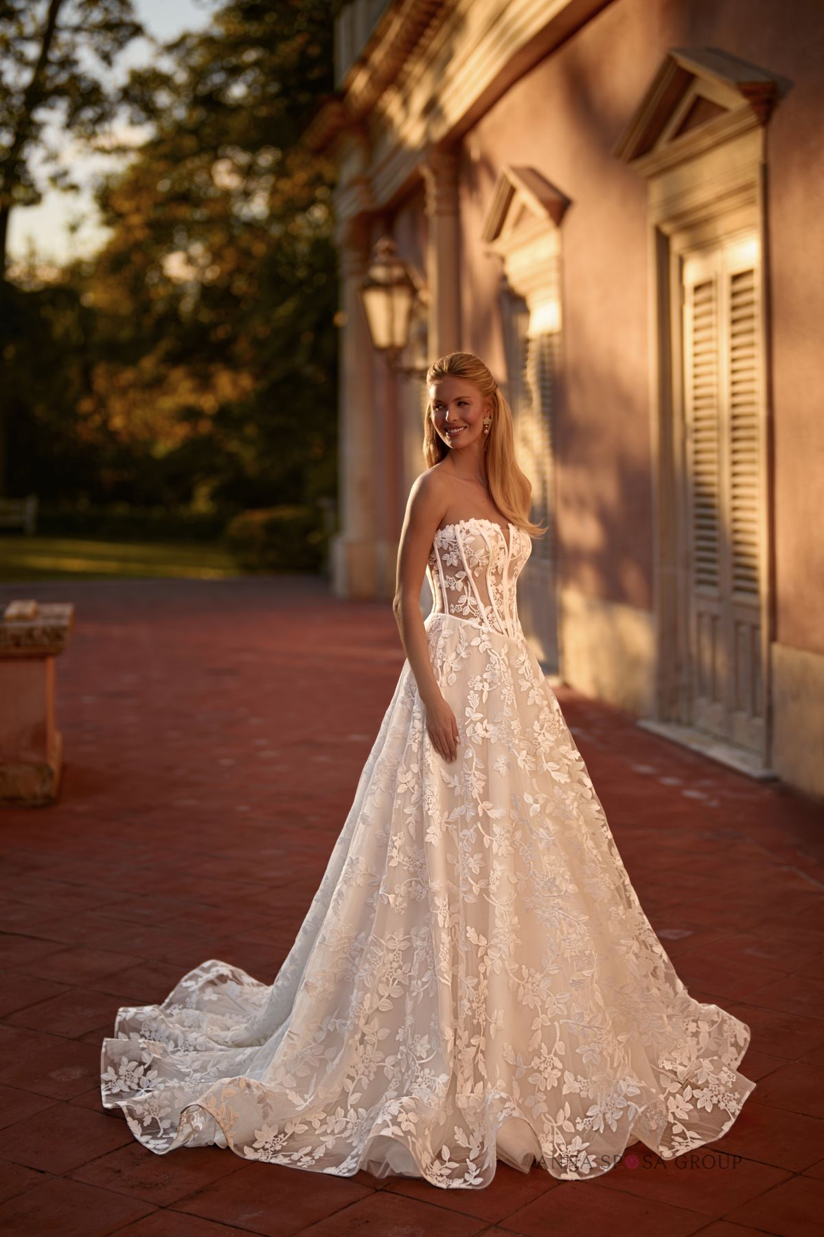 Modena: « une robe luxueuse et luxueuse au style romantique, avec une longue traîne spectaculaire. Généreusement ornée de dentelle, brodée de perles et de paillettes, le haut du corsage et les bretelles dénudées sont ornés d’appliqués floraux faits main, qui confèrent à l’ensemble une allure encore plus délicate et féminine. »