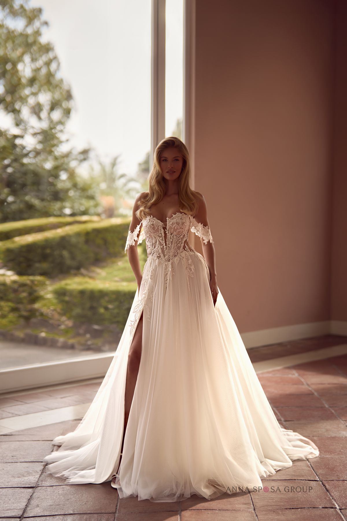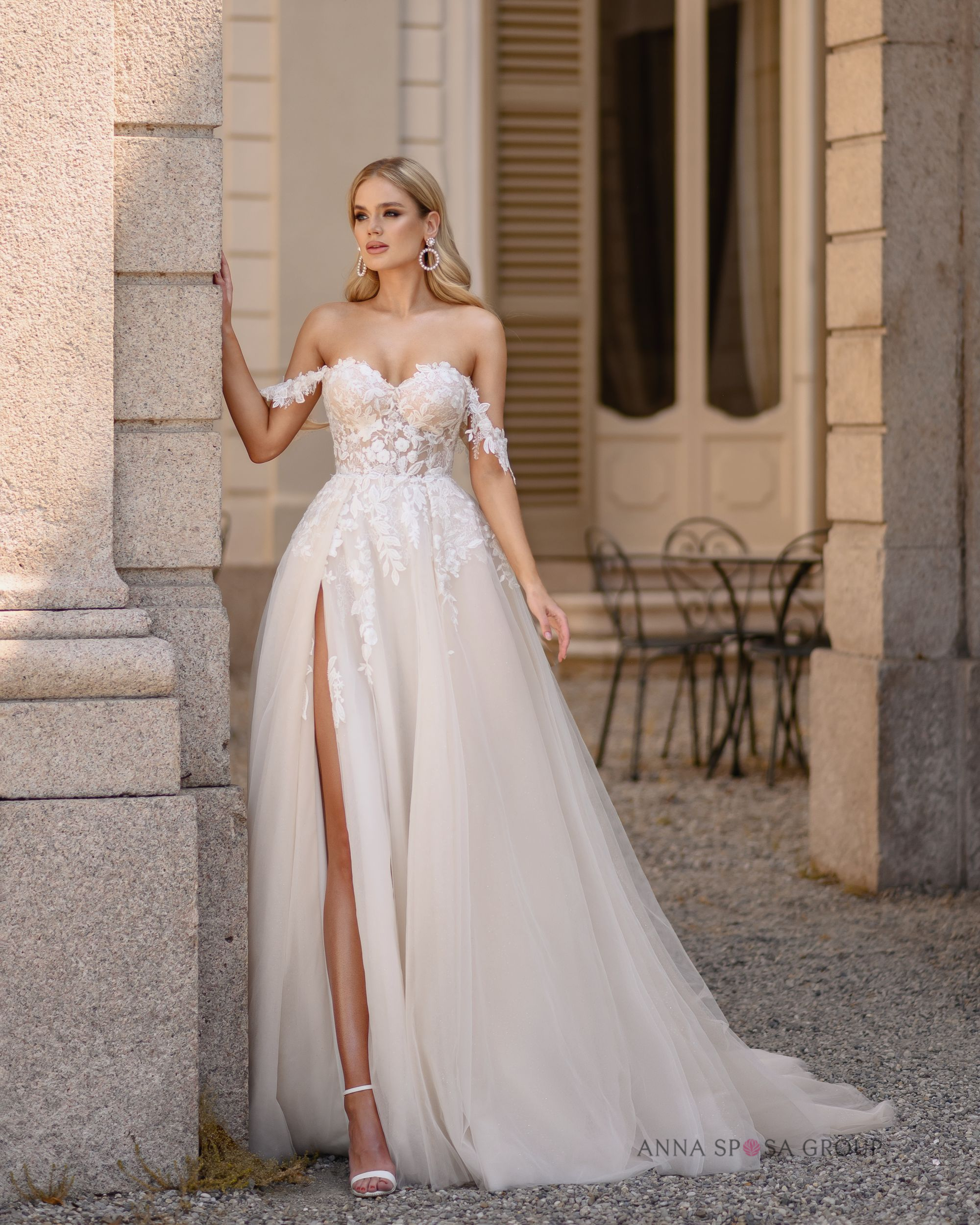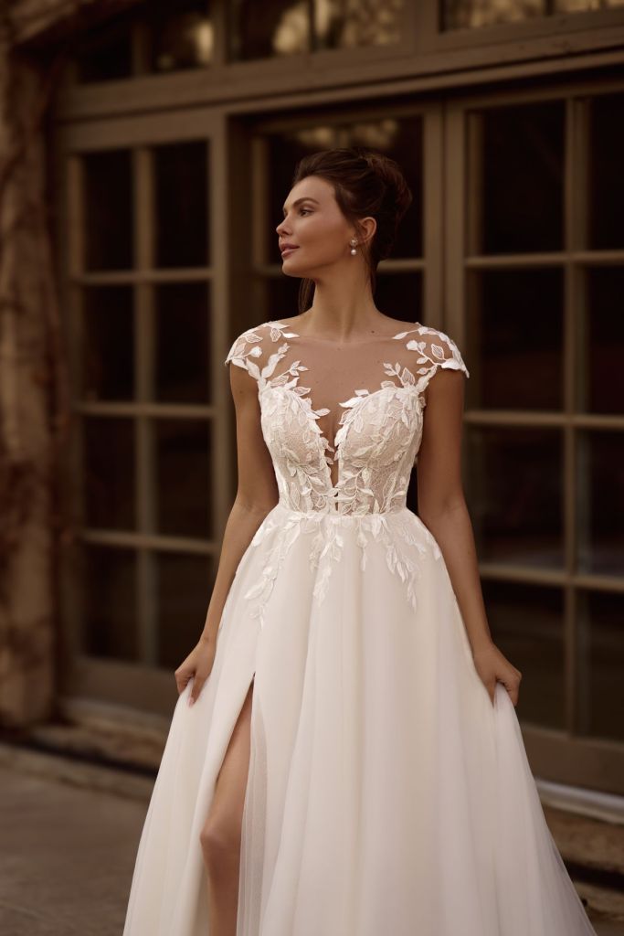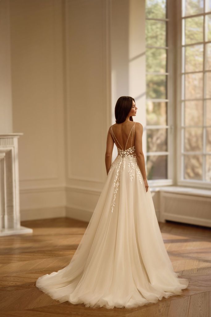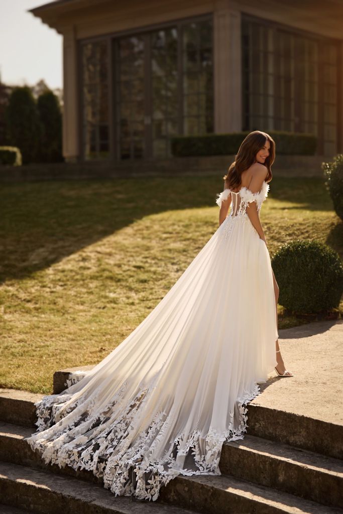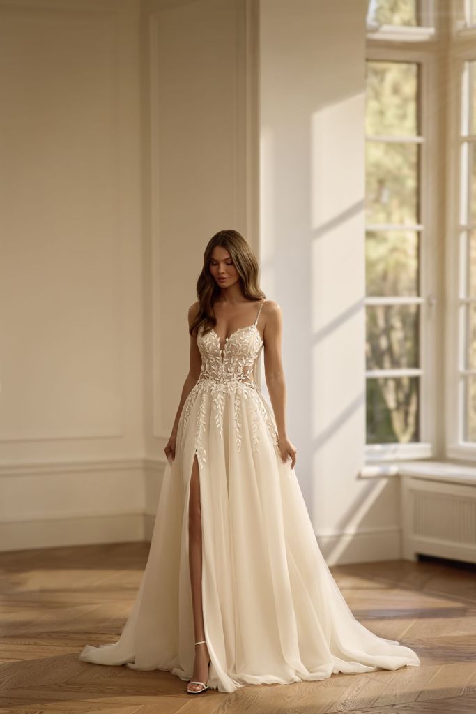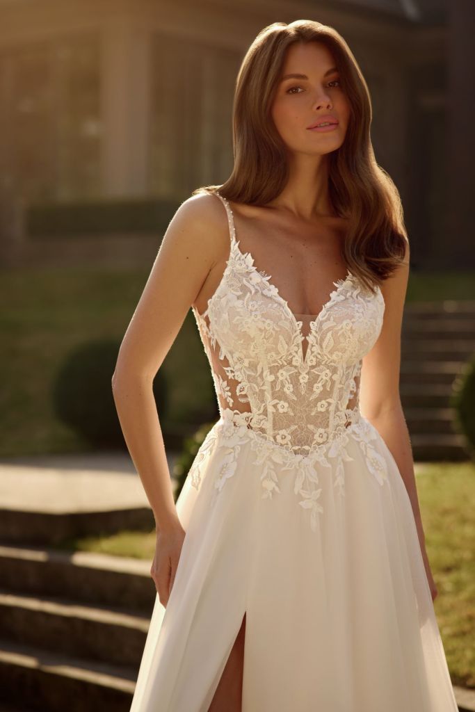 Sunita: » robe romantique à la coupe trapèze classique, avec bretelles en dentelle et épaules dénudées. Généreusement décorée de dentelle florale délicate et d’appliqués floraux faits main. La jupe superposée crée un look léger et aérien, tandis que la fente haute et le décolleté en cœur la rendent plus séduisante. »