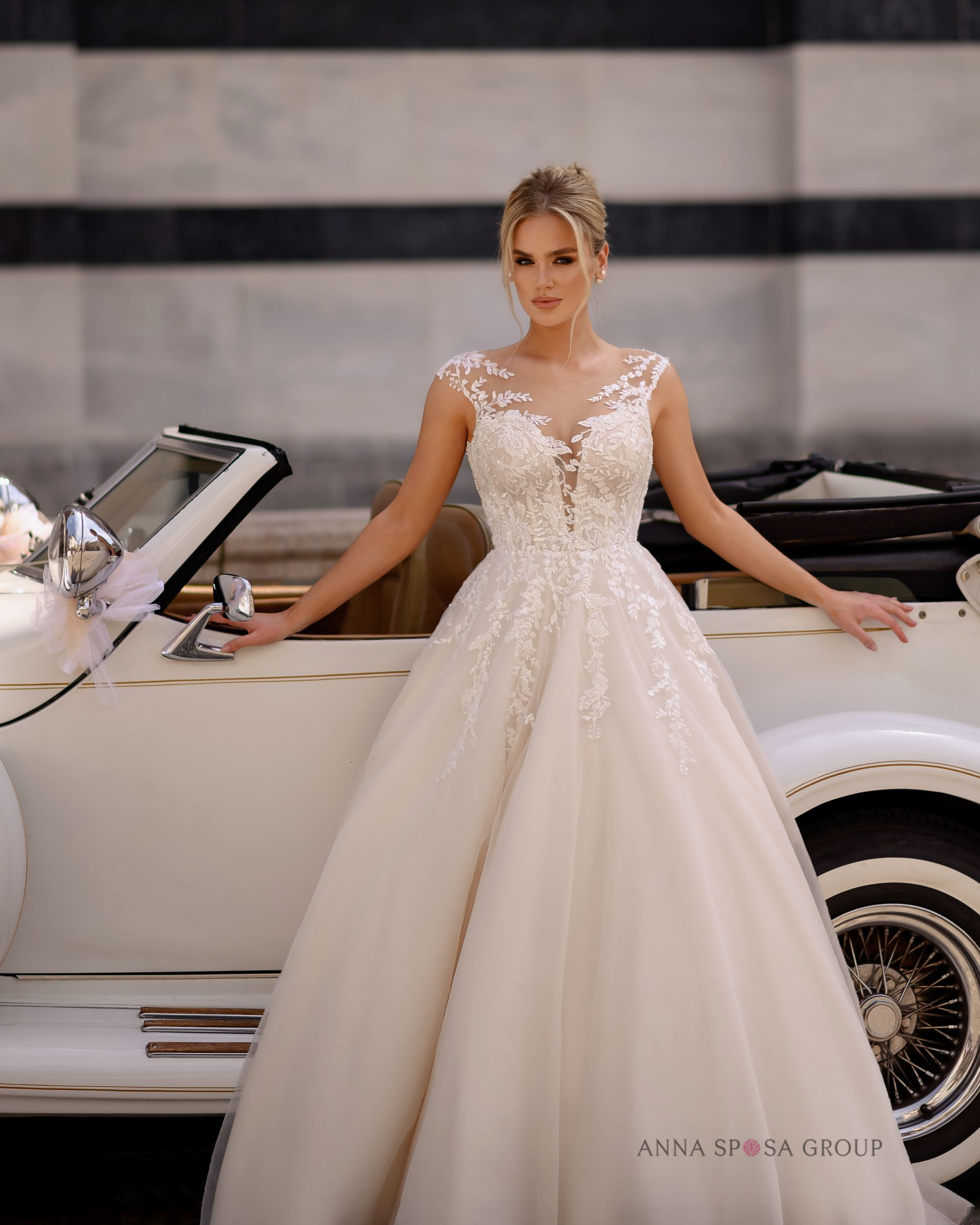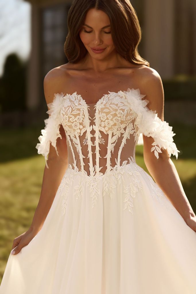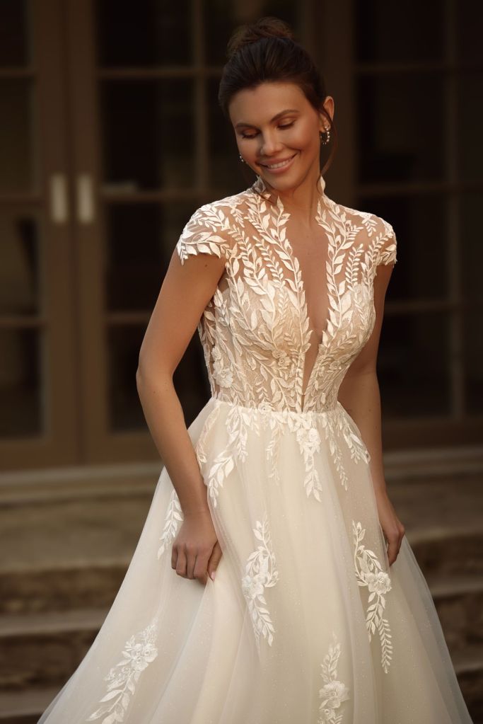 Mable: « une robe luxueuse et raffinée au style romantique, avec des bretelles. Richement décorée de dentelle florale originale, le corset est brodé de perles et de paillettes, et le décolleté est orné d’un empiècement en résille translucide. »