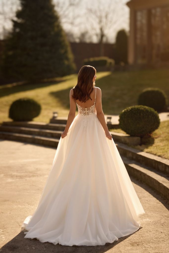 Diamanta : » Une robe trapèze romantique à fines bretelles en dentelle. Le corsage est orné de dentelle florale et d’appliques florales volumineuses faites main. Une délicate jupe en tulle apporte une touche de féminité, de légèreté et de légèreté à ce look. «